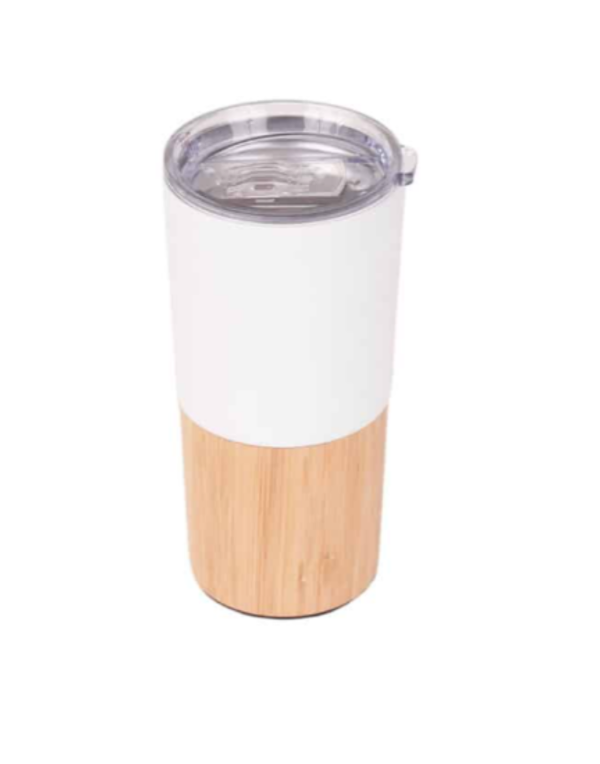 Jarro térmico realizado en doble pared de acero inoxidable, con detalles en bamboo.